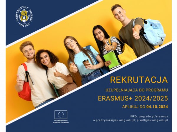 Formularze rekrutacyjne: https://umg.edu.pl/erasmus-do-pobrania należy składać u koordynatorów wydziałowych lub w biurze Erasmus+ (pok. B-104) do 4 października 2024 r.