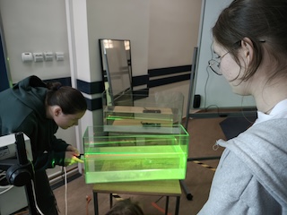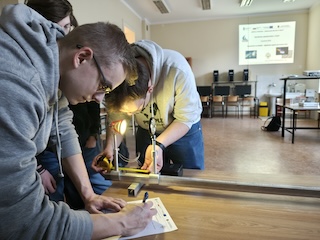Tym razem na zajęciach warsztatowych uczniowie mieli okazję poszerzyć wiedzę z zakresu optyki. W części praktycznej zajęć uczniowie samodzielnie przeprowadzili pomiary mające na celu wyznaczenie ogniskowej soczewki. Przeprowadzali też eksperymenty z użyciem elementów optycznych. W trakcie doświadczeń mieli okazję obserwować, jak soczewki skupiają i rozpraszają światło i jak zwierciadła tworzą różne obrazy.