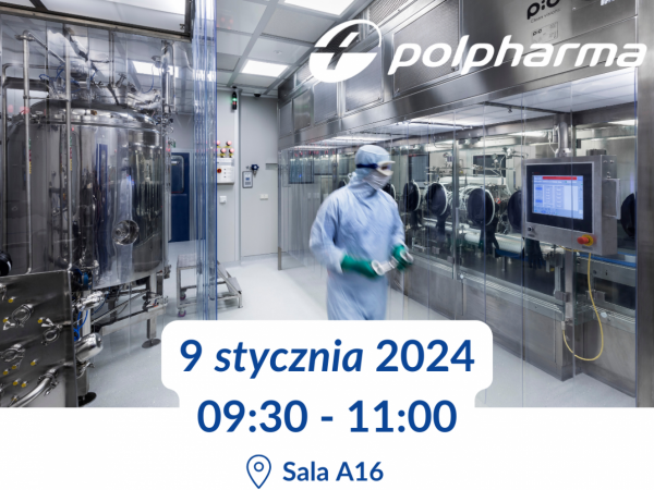 Już jutro, 09.01.2024 r., o godzinie 9:30 zapraszamy na wykład prowadzony przez przedstawicieli firmy Polpharma - największej firmy farmaceutycznej w Polsce. Specjaliści z firmy przybliżą bardzo interesujące tematy, niezwykle ważne dla współczesnego przemysłu: