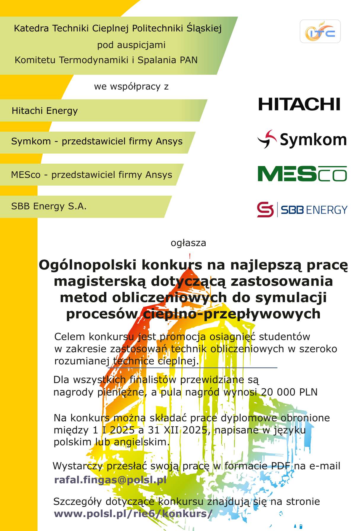 Katedra Techniki Cieplnej Politechniki Śląskiej wraz z partnerami przemysłowymi ogłasza ogólnopolski konkurs na najlepszą pracę magisterską dotyczącą zastosowania metod obliczeniowych do symulacji procesów cieplno-przepływowych. Celem konkursu jest promocja osiągnięć studentów w zakresie zastosowań technik obliczeniowych w szeroko rozumianej technice cieplnej. Dzięki obecności w jury konkursu przedstawicieli przemysłu i firm softwarowych, informacje o najlepszych pracach i ich autorach będą docierać do potencjalnych pracodawców.